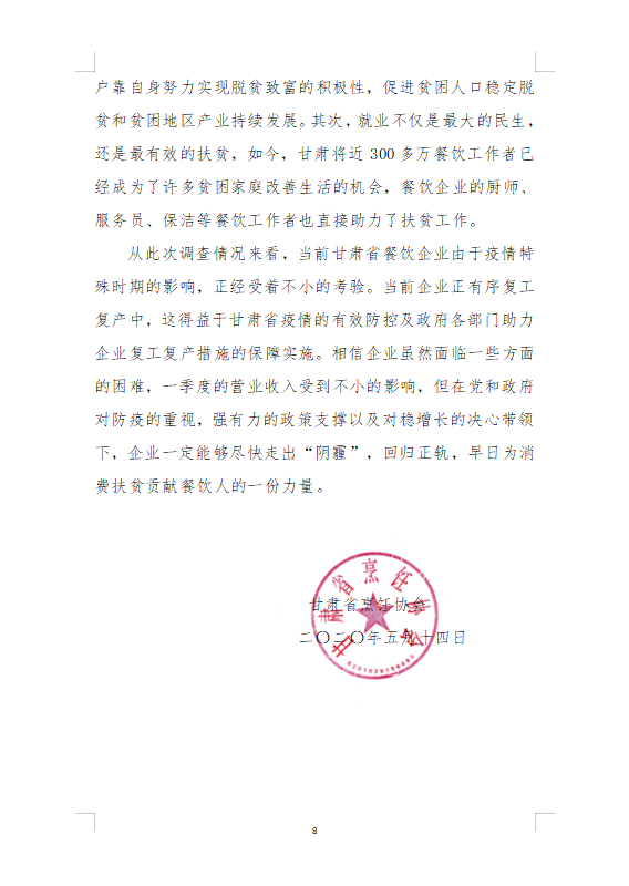 甘肃省烹饪协会在疫情期间对全省餐饮行业的复工 复产考察调研报告